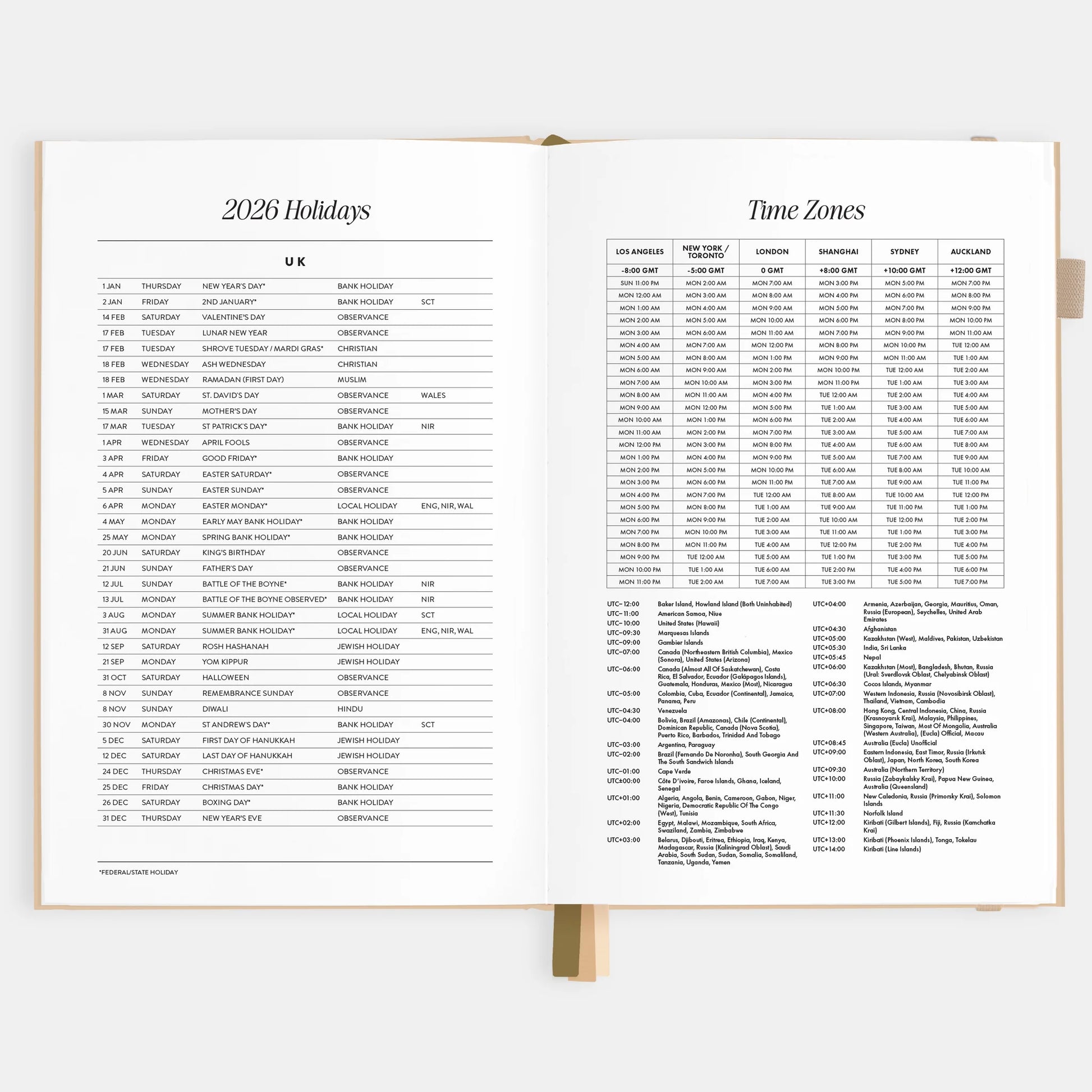 Each 2026 planner has been designed to be beautiful, functional and long-lasting, with patterned end pages, three ribbons and premium 120gsm FCS-certified paper. Holidays & observances for Australia, USA, Canada, UK & New Zealand. Packaged in a cello sleeve with gold foil bellyband.