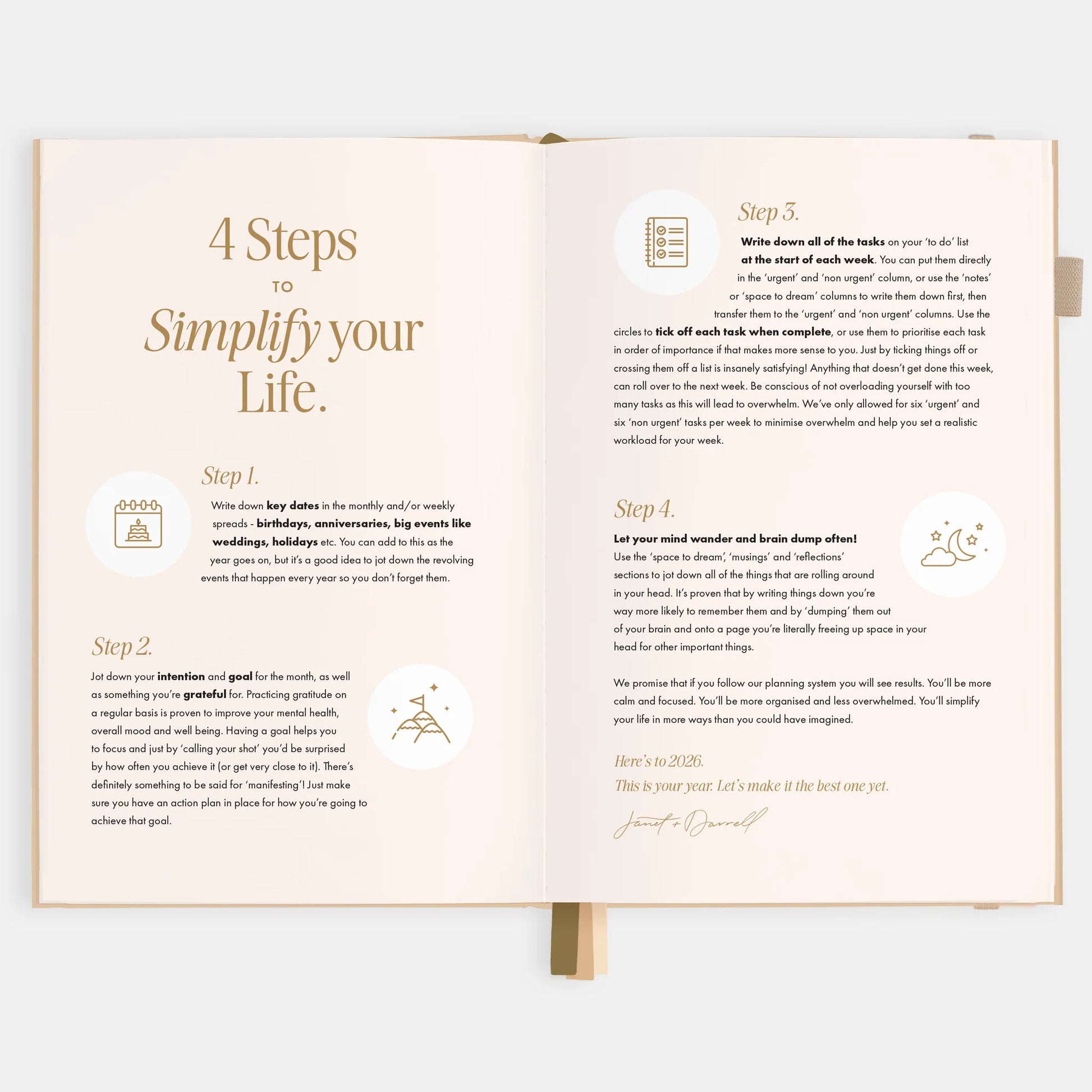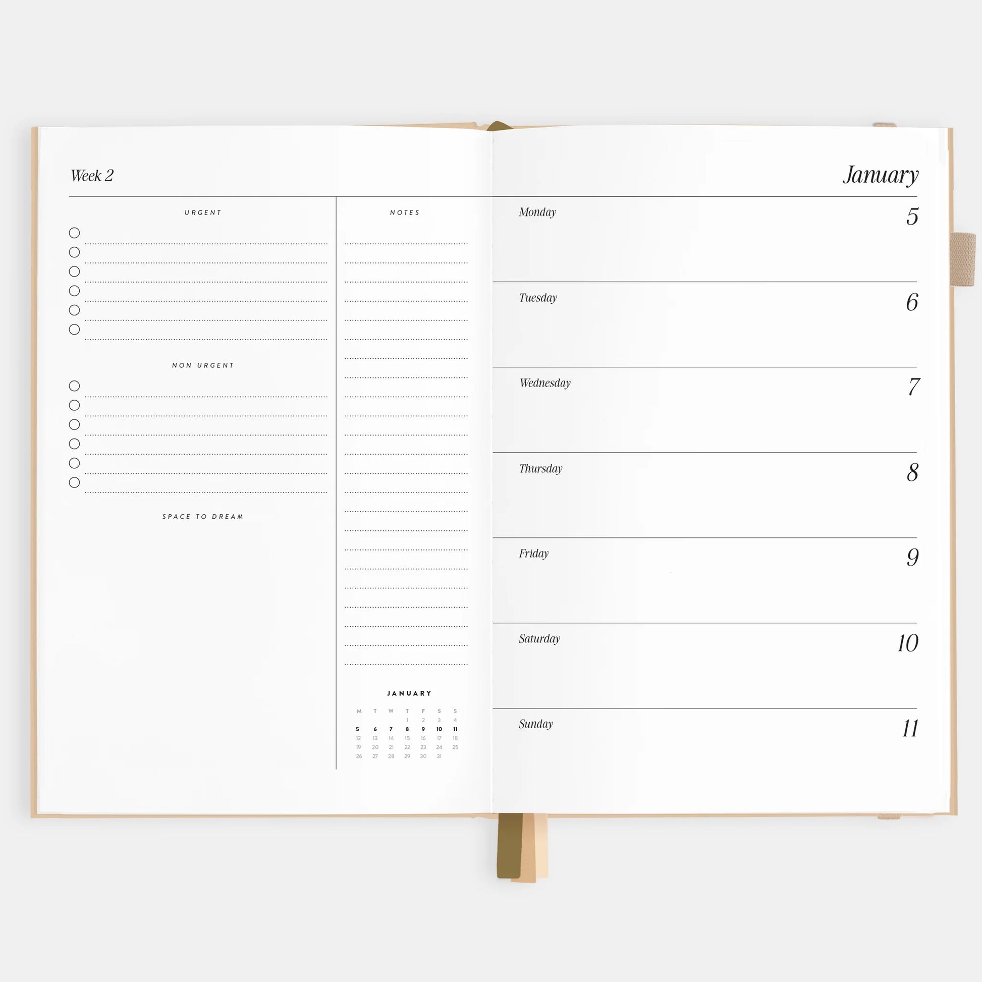 208 pages. One week per spread and monthly spreads at the beginning of each section. Gold foil stamped linen cover with gold foil edging. Three grosgrain ribbons in gold, blush and cream.