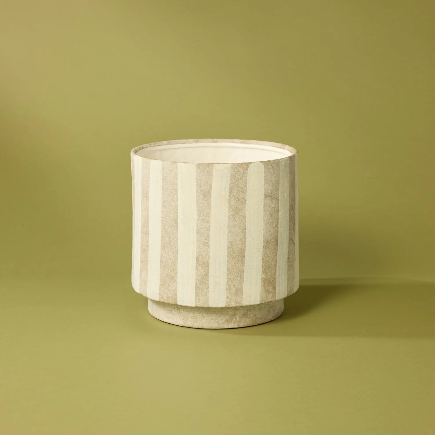 Made from stoneware, this pot has a matte grey finish with white stripes down the exterior. This pot has a drainage hole with optional plug.