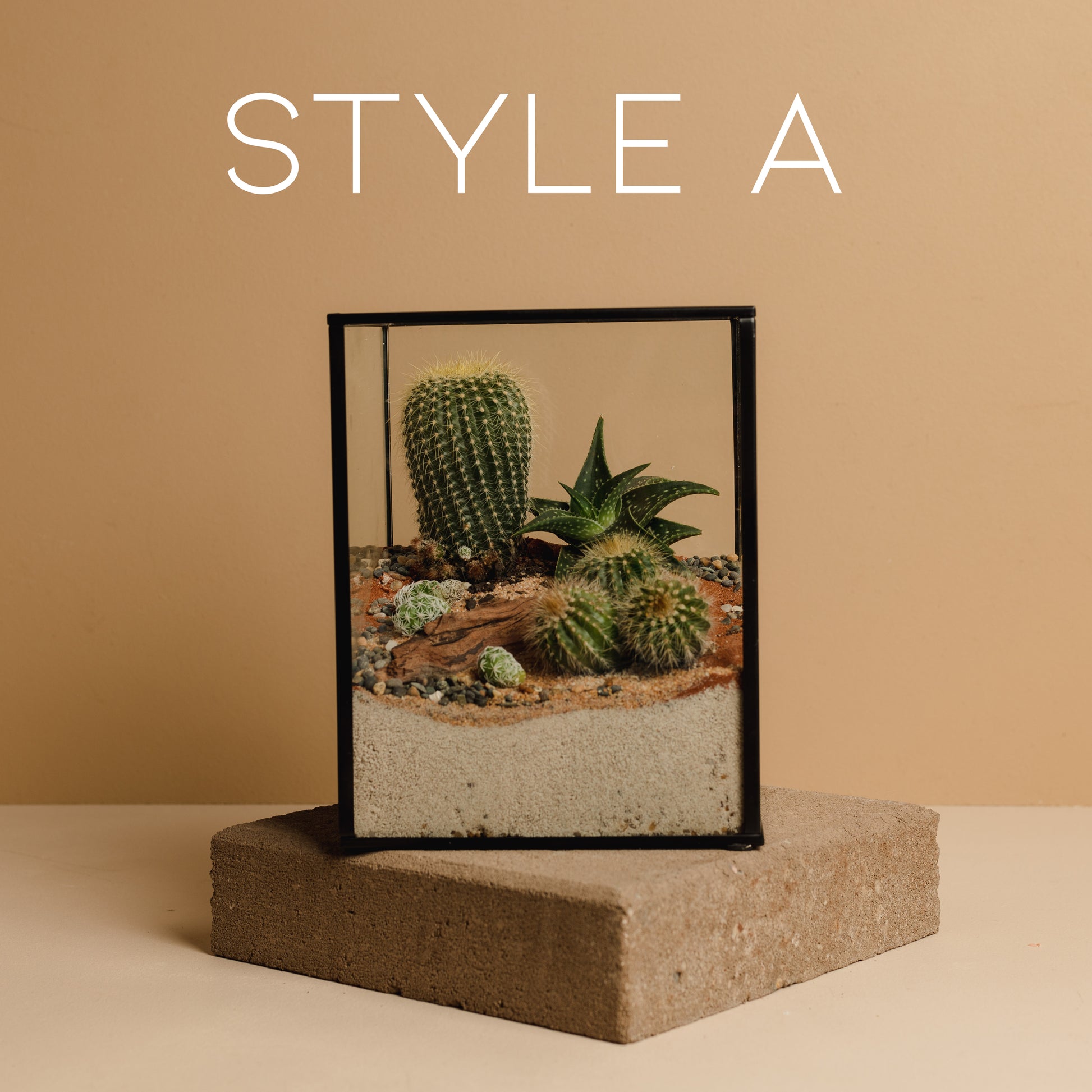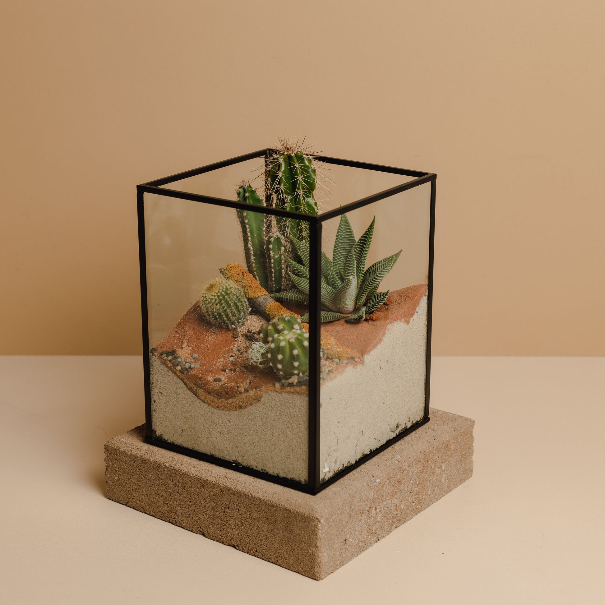 Cacti, Succulents, Sand, pebbles, stone and wood combined into a handmade garden in a glass jar with black metal frame. These miniature gardens are easy care and low maintenance. Water the succulents every 3weeks and the cacti every 4-5weeks. We suggest using a spray bottle to water each plant at it's root. (Mist with 3 spray for each plant) This vessel will do well with good light, it can be direct or indirect.