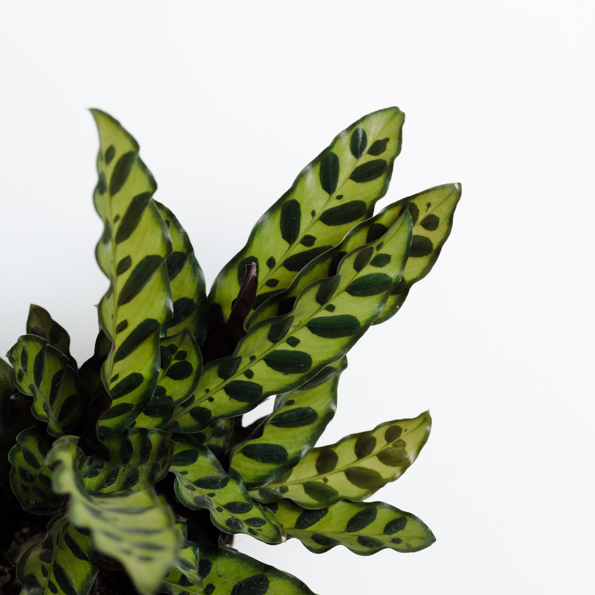 The calathea will do well with good care and the ideal environment. It prefers bright indirect light and consistent watering each week. It will thrive in a humid environment (think kitchens and bathroom).