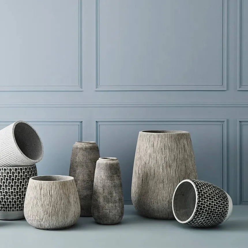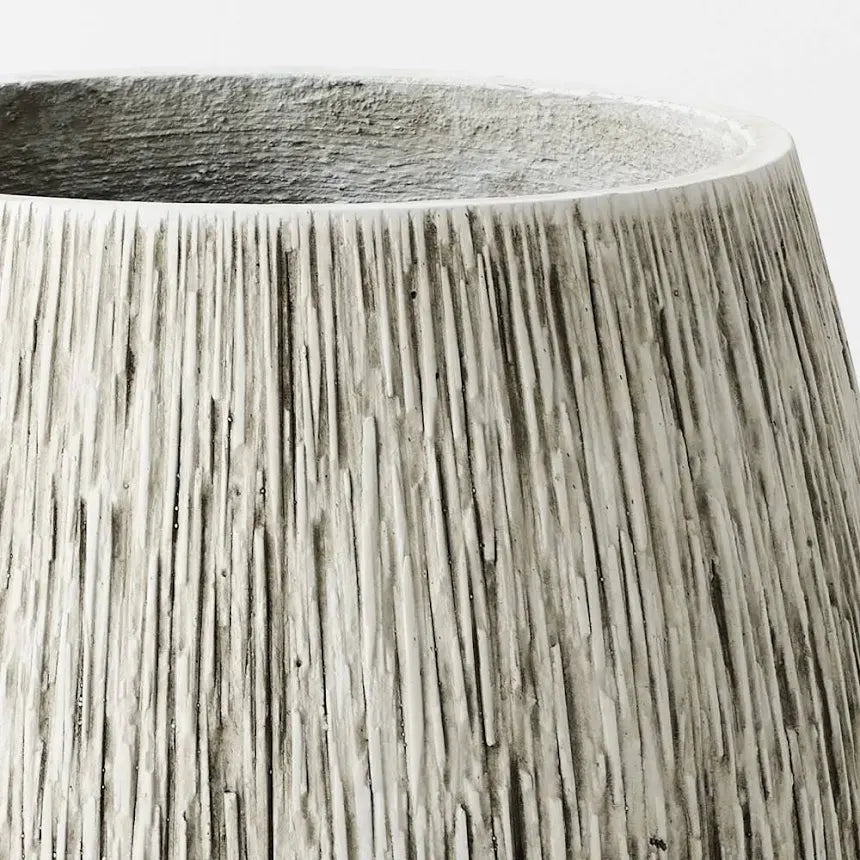Made from concrete and a textured finish. This pot does not have a drainage hole.