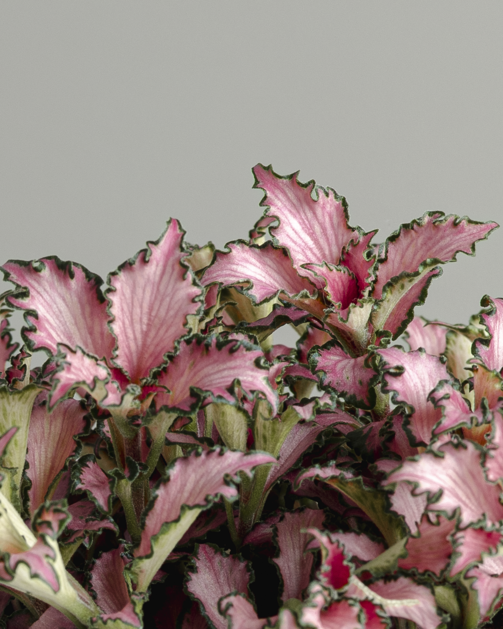 This gorgeous variety has beautiful soft pink and hot pink hues in a vein pattern throughout the upperside of the foliage. The edging of the foliage is dark green and frilly, the underside of the leaf is a soft green.