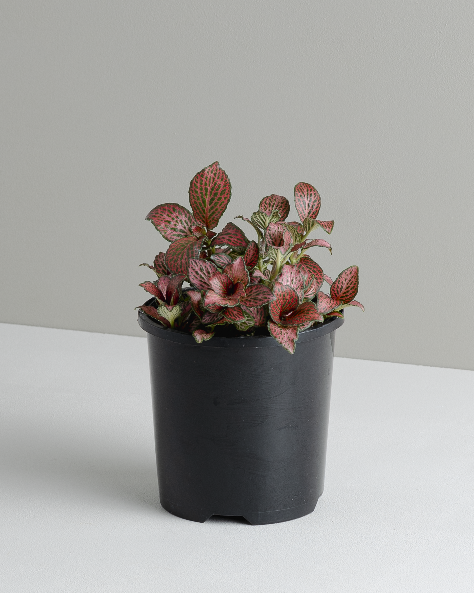 A striking Fittonia with dark green leaves and red veins on the upperside of the foliage.