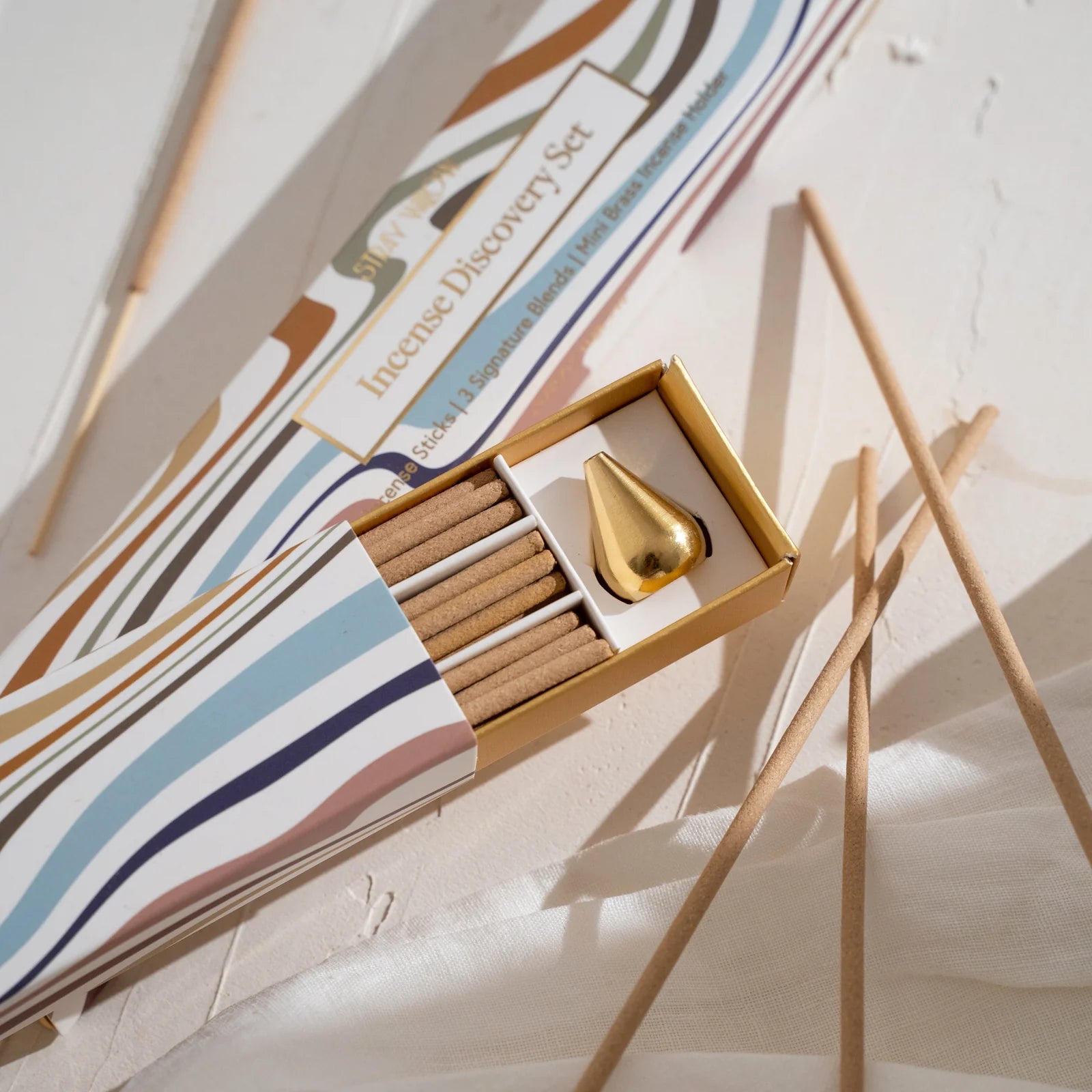 Elevate your space with our Incense Discovery Set, featuring three best-selling natural incense blends—6 Wild Fields, 6 Sweet Muse, and 6 Woodlands—plus a mini brass incense holder. Crafted with pure essential oils, each scent invites calm and connection. A beautiful gift set or a mindful way to explore all three. Sustainably made for meaningful moments of aromatic ritual. WILD FIELDS: Natural Oil Blend: Jasmine + Bergamot + Neroli + Rose Geranium + Vanilla - Help to relieve stress and anxiety. This combination of essential oils has a relaxing and restful effect on body and mind.