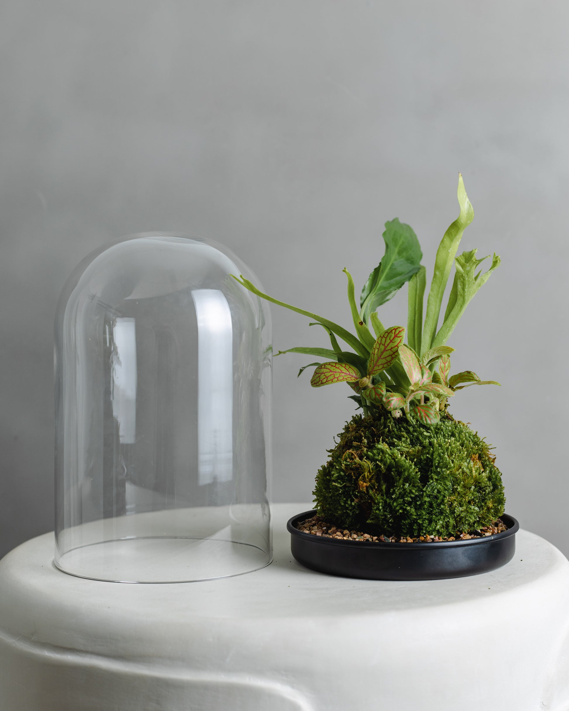 Living Moss and plant made into a mini kokedama. Made to size to fit into a glass greenhouse with a black base and natural toned pebbles. Each mossball is handmade.