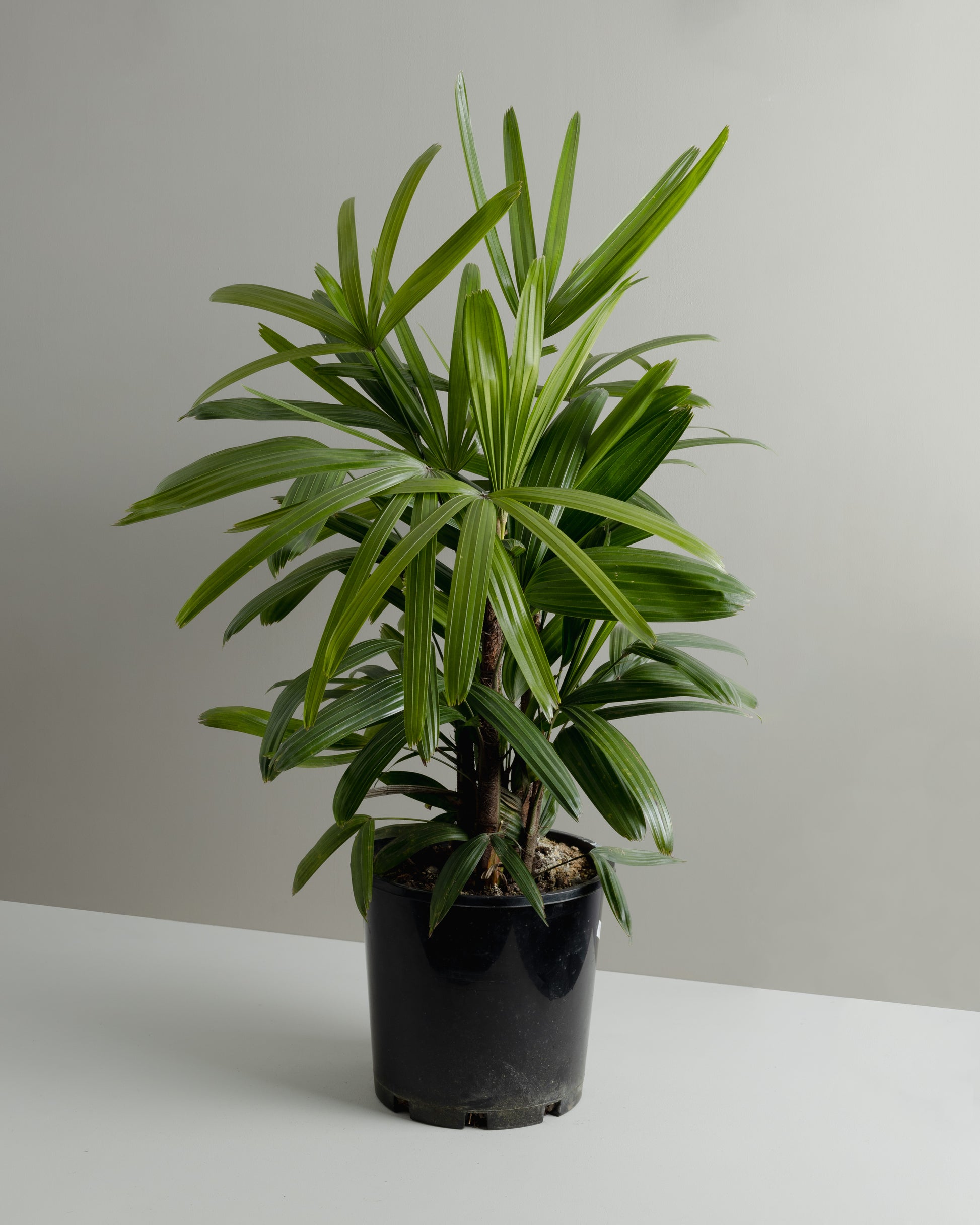 A Hardy plant that will do best indoors in bright, filtered light or outdoors in part shade. While they can tolerate part sun, they can sometimes yellow if the sun is too strong for the plant. It can tolerate low-light conditions, it has large, hand-shape leaves with long, glossy, dark green, finger-like leaflets. The foliage forms a dense canopy above clumps of sturdy stems that are covered with dark brown fibers that have a woven appearance.