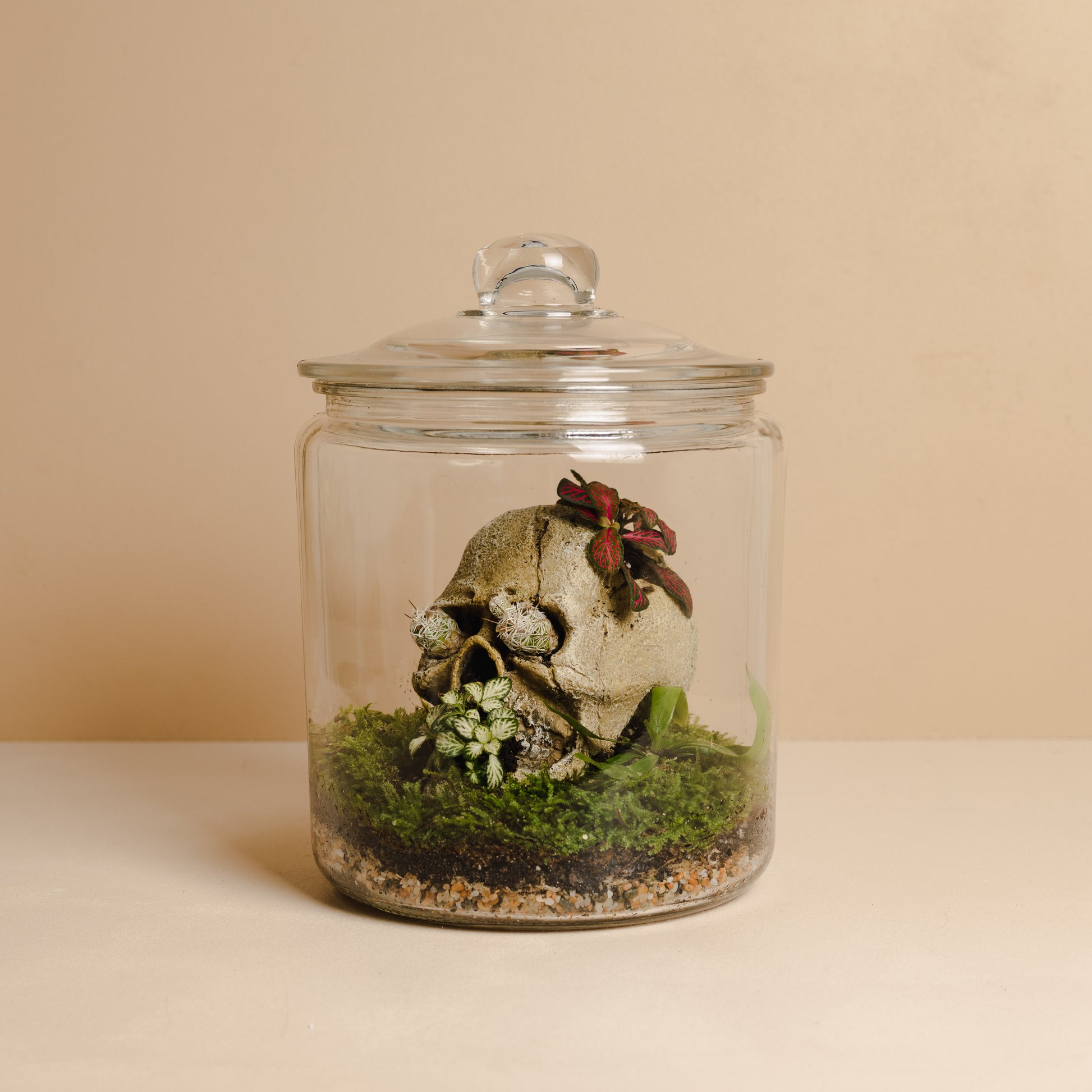 Living Terrarium featuring live moss, an assortment of terrarium happy plants. A faux skull is the centrepiece of this vessel. Each terrarium is handmade in a glass vessel with a glass lid.