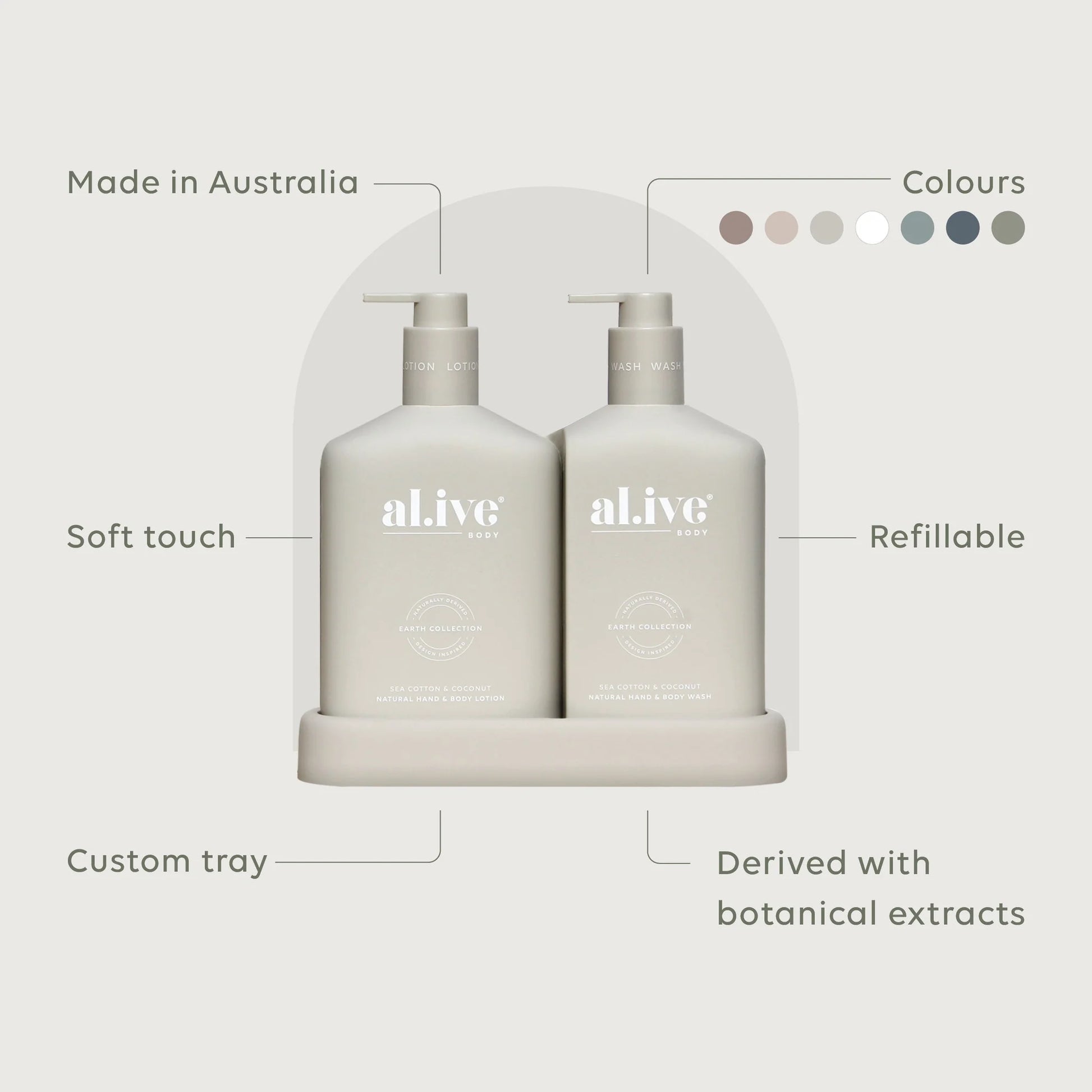 The Duo includes a 500ml hand & body wash, 500ml hand & body lotion and a matching tray.